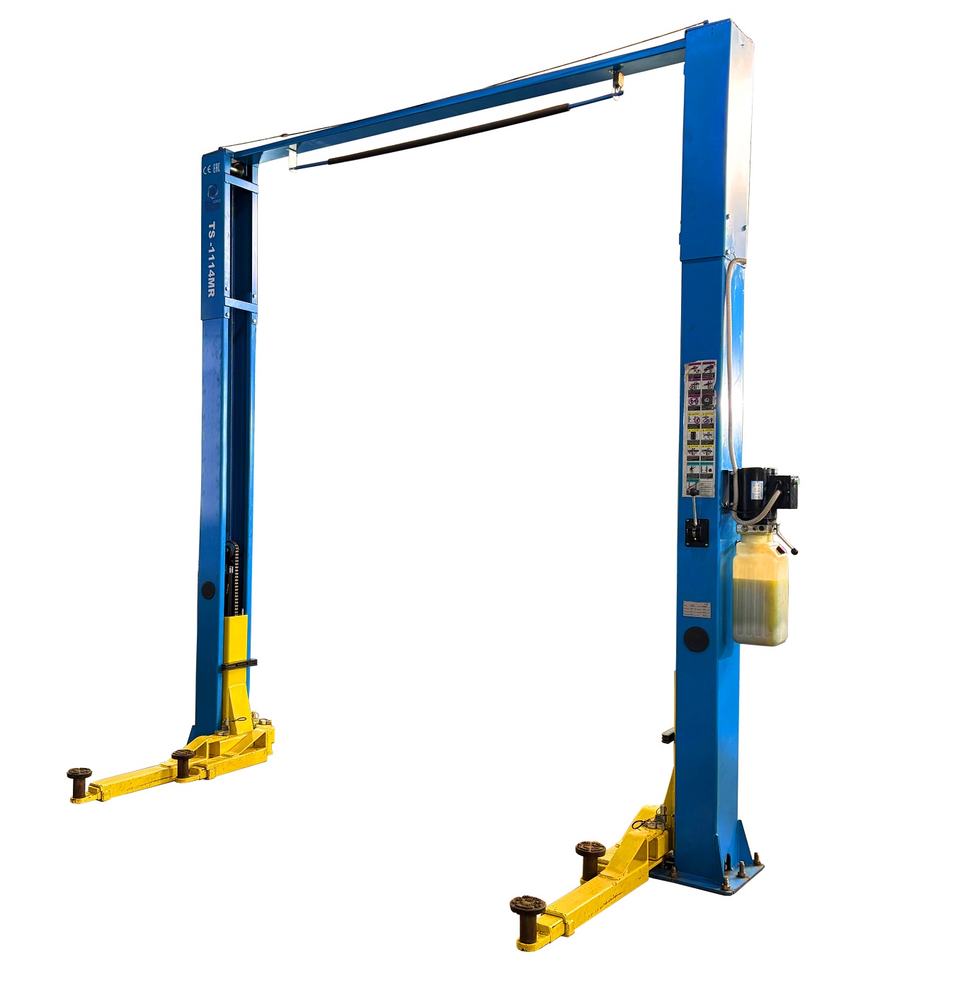 Автомобильный электрогидравлический подъемник с верхней связью грузоподъемностью 4 тонны TS-1114MR съем со стопоров происходит централизованно с помощью рычага расположеного на колонне, что позволяет эффективно и безопасно опускать автомобиль с подъемника. Ограничитель подъёма при достижении максимальной высоты. Предназначен для подъема легковых автомобилей и джипов.