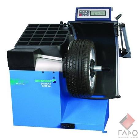Балансировочный стенд HOFMANN GEODYNA 6300-2P для колес легковых автомобилей с ЖК дисплеем для АЗС, шинных центров и дилерских СТО со средней и высокой загрузкой; с электромеханическим зажимом Power Clamp; свойства включают автоматический ввод расстояния, диаметра и ширины обода и автоматическое предварительное определение места установки груза в режиме easyALU.