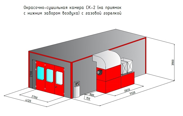 Покрасочная камера СК-2 поставляется с внутренними рабочими размерами: 7200x4000x2900 мм. Окрасочная камера СК-2 подходит для покраски легковых автомобилей, джипов. Поставляется в трех вариантах (с дизельной и газовой горелкой и электрическими ТЭНами) имеет полностью решетчатый пол. Пожаробезопасные стеновые и потолочные панели с наполнителем из минеральной ваты. Внутренняя поверхность стен с антибликовым покрытием.